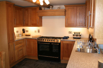 | The Hay Barn was completed in July 2007 and comprises a quality barn conversion encompassing traditional features including stone, wood and slate with all modern comforts. The barn has two large oak-floored en-suite bedrooms (Sleeps 5 + cot), a large living kitchen and a comfortable lounge together with a patio. The kitchen comprises solid oak cupboards, with range cooker with quaint windows overlooking the private lawn. There is a chunky oak table with 6 chairs sat on slate floors. The whole kitchen is lit with feature lights and is cosy yet spacious. The lounge has an oak floor with large leather sofas arranged around a stone fire-place with woodburner and flat screen TV/DVD with Freeview. The lounge has unique stripped pine furniture giving a warm feeling. All of the downstairs has under-floor heating. Bedroom One is a spacious room with a king-size bed and en-suite bathroom decorated in creams and greens with wonderful views over the garden and fields beyond. Bedroom Two has a Super King size bed that can double up as twin beds (zip together) together with a further single bed and en-suite shower room.